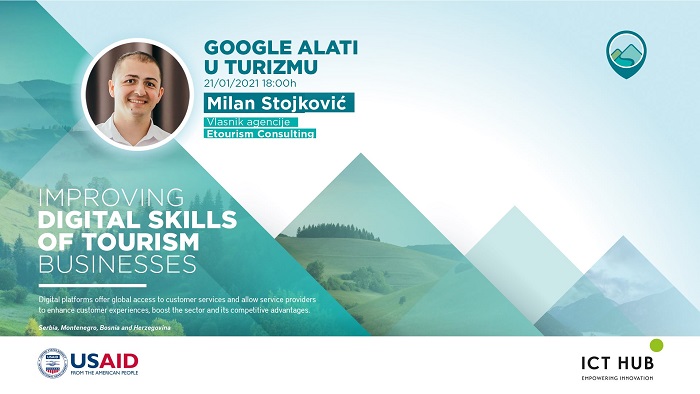ICT Hub, u saradnji sa partnerima JS Guruom iz Bosne i Hercegovine i Digitalizuj.Me iz Crne Gore, organizuje besplatnu online radionicu „Google alati u turizmu“, koja će se održati u četvrtak, 21. januara, u 18:00h. Prijava za radionicu je dostupna na adresi https://bit.ly/3oXW7Ms. Radionica se realizuje u okviru USAID-ovog projekta „D-Tour: Unapređenje digitalnih veština za turističke objekte u Srbiji, Bosni i Hercegovini i u Crnoj Gori“.