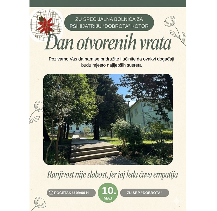 Specijalna bolnica za psihijatriju „Dobrota“ u nedjelju, 10. maja, sa početkom u 9 sati organizuje Dan otvorenih vrata.