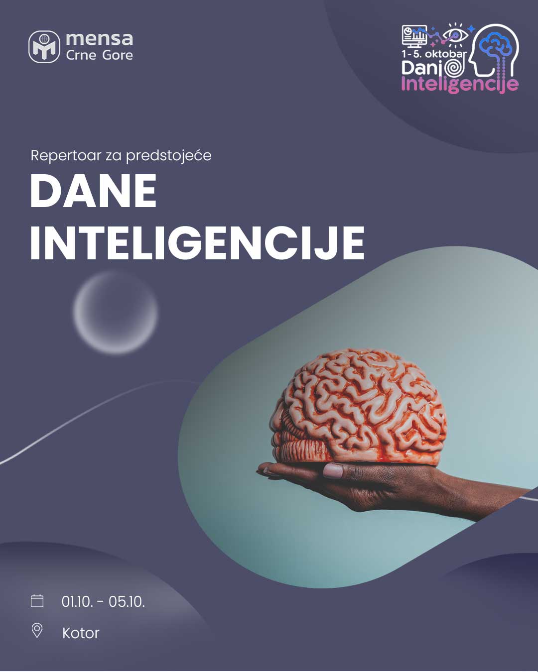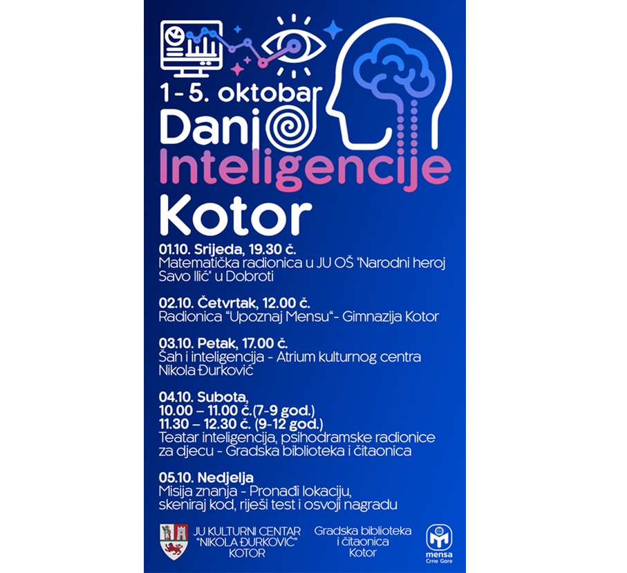 Mensa Crne Gore u saradnji sa Opštinom Kotor, Kulturnim centrom „Nikola Đurković“, Gradskom bibliotekom i čitaonicom, Turističkom organizacijom i Gimnazijom Kotor od 1. do 5. oktobra organizuje program Dani inteligencije u Kotoru. Planirano je da se svakog dana održi po jedna aktivnost.