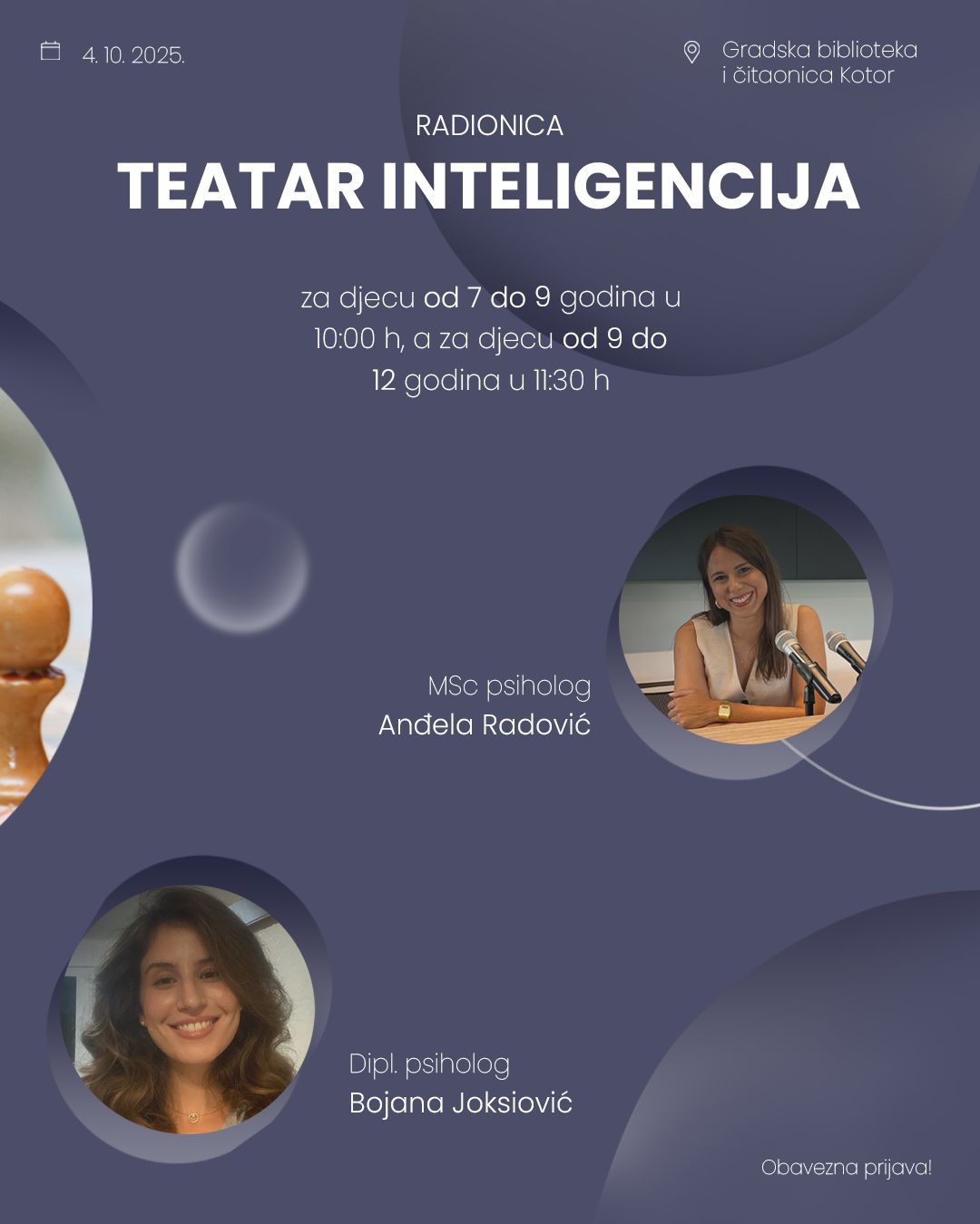Subota 4. oktobra rezervisana je za radionicu „Teatar inteligencija“, odnosno psihodramske radionice za djecu, koje će biti organizovane u Gradskoj biblioteci i čitaonici. Program je podijeljen u dva termina: od 10 do 11 sati za djecu uzrasta od 7 do 9 godina, te od 11.30 do 12.30 za uzrast od 9 do 12 godina. Radionice će voditi psihološkinje mr Anđela Radović i Bojana Joksimović.