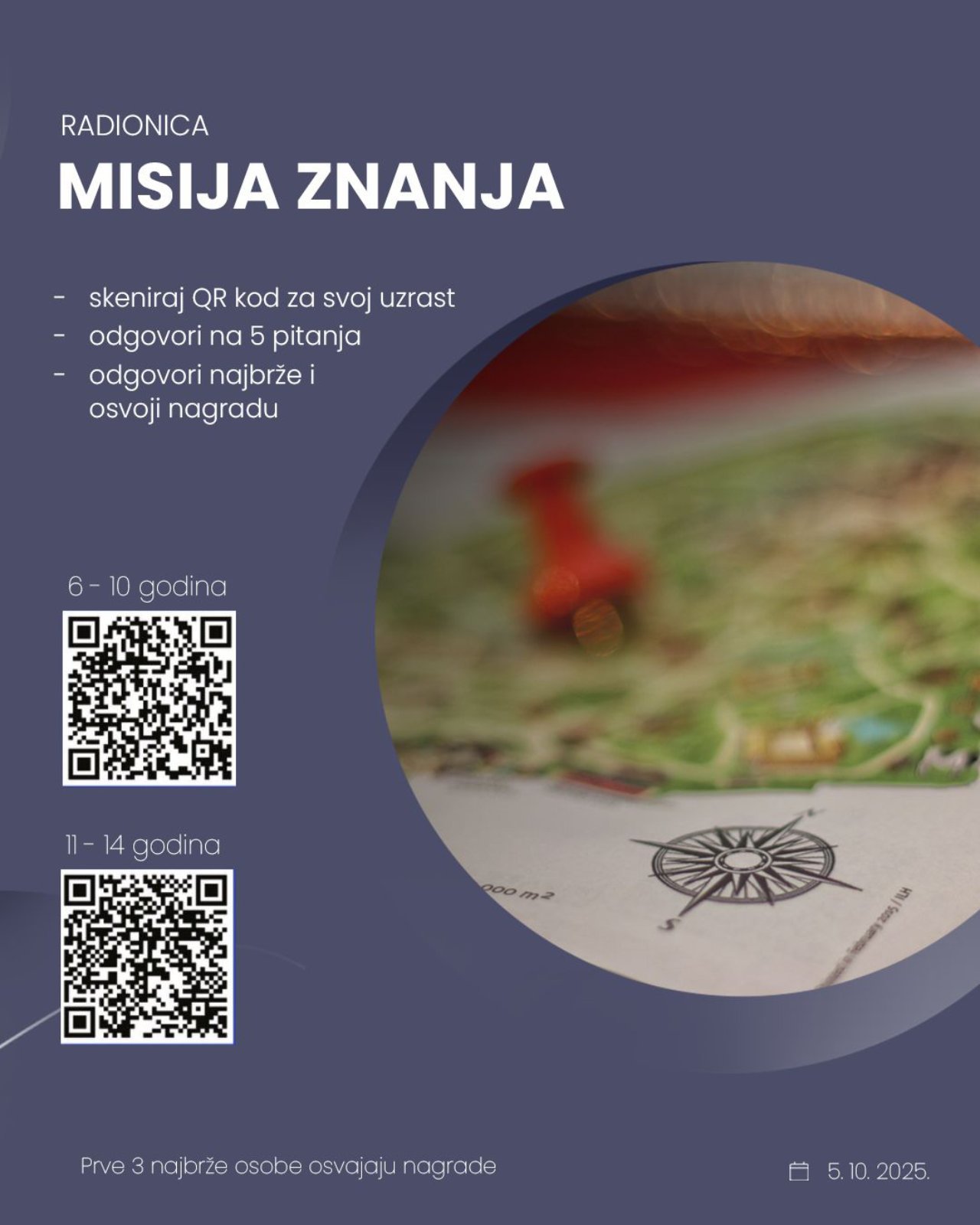 Manifestacija će biti završena u nedjelju 5. oktobra radionicom „Misija znanja“. Učesnici će imati zadatak da pronađu određenu lokaciju, skeniraju kod, riješe test i na taj način osvoje nagradu.
