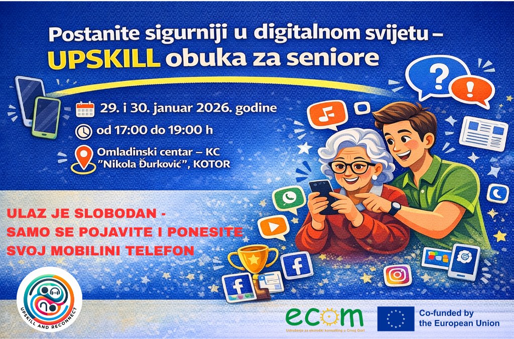 Nevladina organizacija ECOM, u saradnji sa Omladinskim centrom Kotor, organizuje prvu besplatnu obuku digitalnih vještina za seniore, u okviru Erasmus+ projekta „UPSKILL & Reconnect“. Obuka je namijenjena svim starijim osobama koje žele da unaprijede svoje znanje i sigurnost u korišćenju pametnih telefona i savremenih digitalnih servisa. Dvodnevna obuka će se održati 29. i 30. januara 2026. godine, od 17:00 do 19:00 časova, u Omladinskom centru – Kulturnom centru „Nikola Đurković“ u Kotoru.