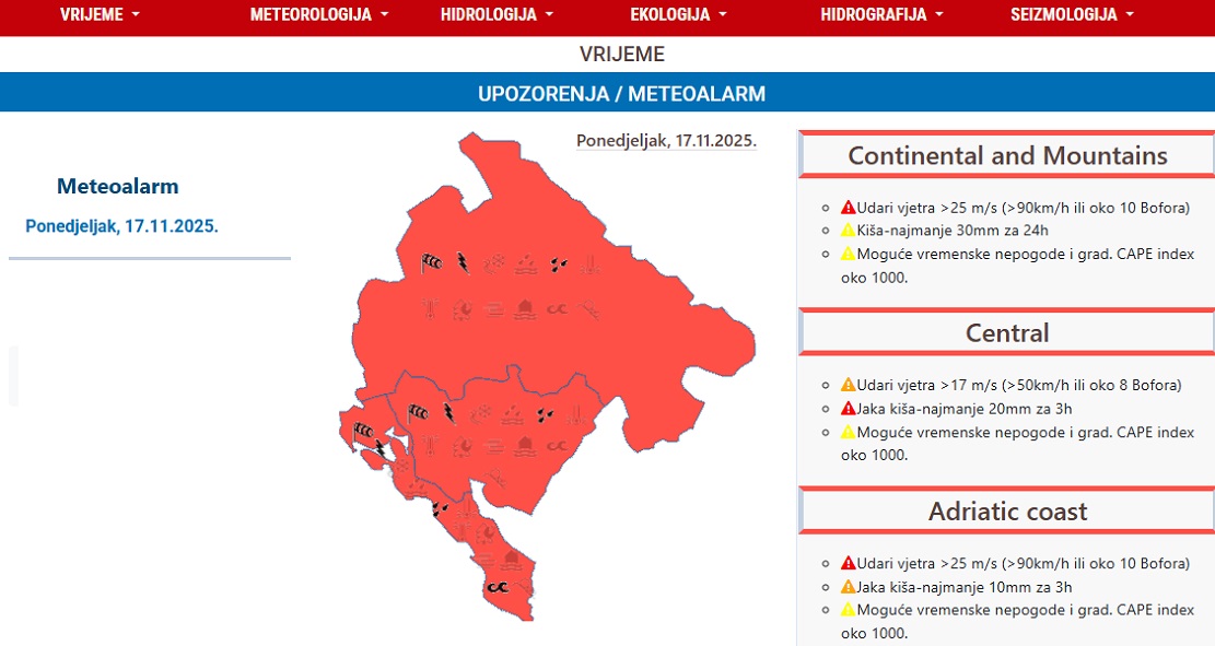 Na osnovu informacija Zavoda za hidrometeorologiju i seizmologiju Crne Gore (ZHMS), u narednih 7 do 8 dana očekuju se obilne padavine, praćene jakim, ponegdje i olujnim vjetrom južnog i jugoistočnog smjera. Zbog ovakvih meteoroloških uslova, postoji mogućnost pojave vremenskih nepogoda na pojedinim lokalitetima. Iz Direktorata za zaštitu i spašavanje Ministarstva unutrašnjih poslova obavještavaju javnost da ovakva situacija može značajno otežati obavljanje svakodnevnih aktivnosti i izazvati određene posljedice na terenu.