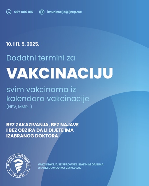 Napominjemo da se ovi termini organizuju usljed niskih obuhvata vakcinacijom pojedinim vakcinama iz kalendara redovne vakcinacije. Obuhvati MMR vakcinom su i dalje na niskom nivou, značajan broj djece kasni sa vakcinacijom, a slučajevi morbila su u ranijem periodu detektovani i u našoj zemlji. Takođe, pozivamo sve roditelje da iskoriste mogućnost i zaštite djevojčice i dječake uzrasta 9-14 i 15-18 godina vakcinom protiv humanog papiloma virusa (HPV).