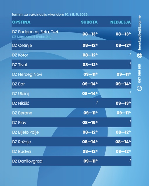 Institut za javno zdravlje Crne Gore i domovi zdravlja nastavljaju sa organizovanjem dodatnih termina za vakcinaciju djece prema kalendaru redovne vakcinacije. Vakcinacija se obavlja radnim danima direktno u dogovoru sa timovima izabranih doktora za djecu, a termini vikendima se organizuju kao dodatna mogućnost za svu djecu, bez obzira da li su direktno pozvani i da li imaju izabranog doktora ili ne, a naročito za one koji kasne sa primanjem određenih doza vakcina.