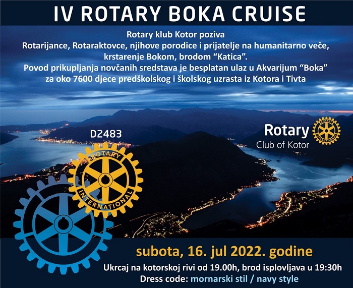 Rotari klub Kotor, večeras organizuje tradicionalno donatorsko krstarenje Bokokotorskim zalivom brodom “Katica”, a cilj ovogodišnje humanitarne akcije pod nazivom “Morski svijet djeci Kotora i Tivta” je obezbijeđivanje besplatanog ulaza u Akvarijum “Boka” za oko 7600 djece predškolskog i školskog uzrasta iz Kotora i Tivta.