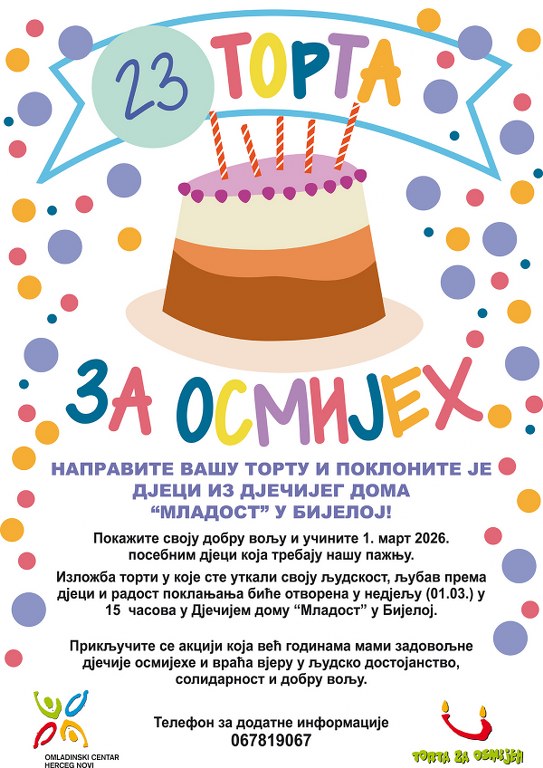 23. humana akcija "Torta za osmijeh" biće održana u nedelju 01. marta.