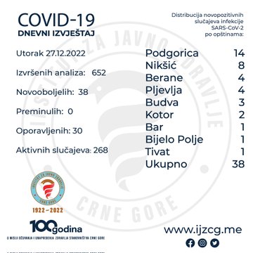 U Crnoj Gori je, u posljednja 24 sata, registrovano 38 novih slučajeva koronavirusa od čega su dva slučaja zabilježena u Kotoru, a nije prijavljen nijedan smrtni ishod povezan sa infekcijom, saopšteno je iz Instituta za javno zdravlje (IJZ).