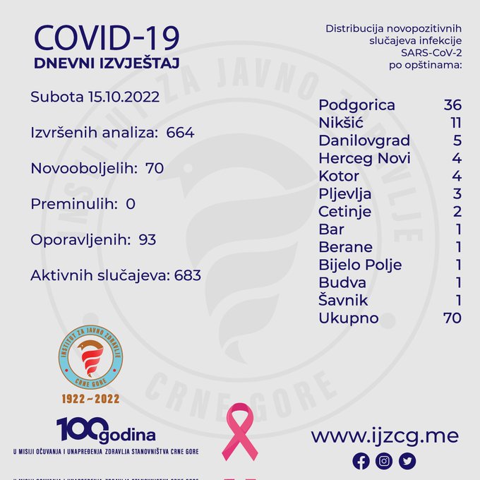 Iz Instituta za javno zdravlje (IJZ) saopšteno je da su njihove i druge javne i privatne laboratorije koje se bave dijagnostikom infekcije koronavirusa tokom subote završile analizu i dostavile rezultate za 664 uzorka.