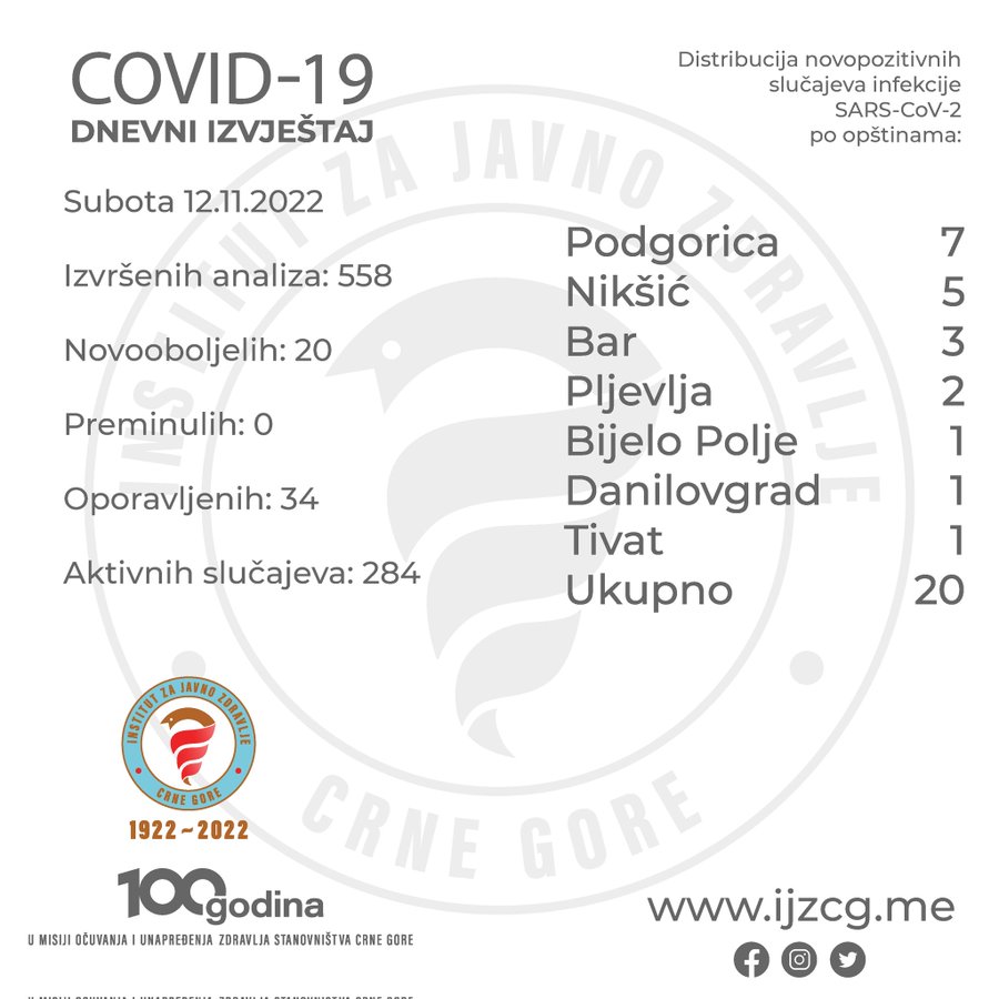 Iz Instituta za javno zdravlje (saopšteno je da su njihove i druge javne i privatne laboratorije koje se bave dijagnostikom infekcije koronavirusa tokom petka završile analizu i dostavile rezultate za 558 uzorak.