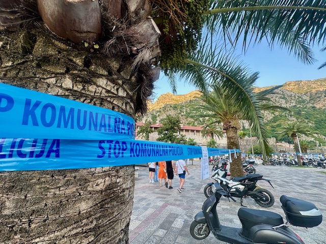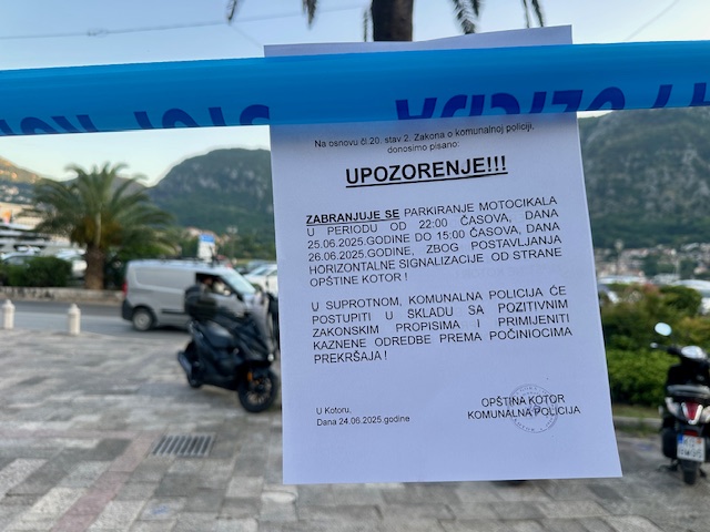 Komunalna policija Opstine Kotor zabranila je parkiranje motocikala na gradskoj rivi, čiji je jedan dio ogradjen trakama upozorenja postavljenim na stablima palmi, u periodu od danas u 15 sati do sjutra (26.06.2025. god.), u 15 sati. Kako se navodi na upozorenjima, parkiranje se zabranjuje zbog postavljanja horizontalne signalizacije od strane Opštine Kotor.