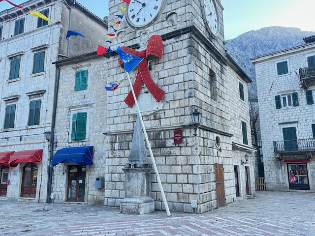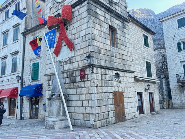 Stub, koji se nalazi ispod Kule od sata u Starom gradu, na kojem su 15. februara podignute karnevalske zastave je, kako danas bilježimo, nakrivljen.