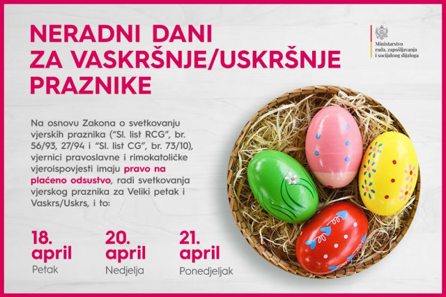 “Na osnovu Zakona o svetkovanju vjerskih praznika (“Sl. list RCG”, br. 56/93, 27/94 i “Sl.list CG”, br. 73/10), vjernici pravoslavne i rimokatoličke vjeroispovjesti imaju pravo na plaćeno odsustvo, radi svetkovanja vjerskog praznika za Veliki petak i Vaskrs/Uskrs, i to: petak 18. april, nedjelja 20. april i ponedjeljak 21. april”, navodi se u saopštenju resora rada, zapošljavanja i socijalnog dijaloga.