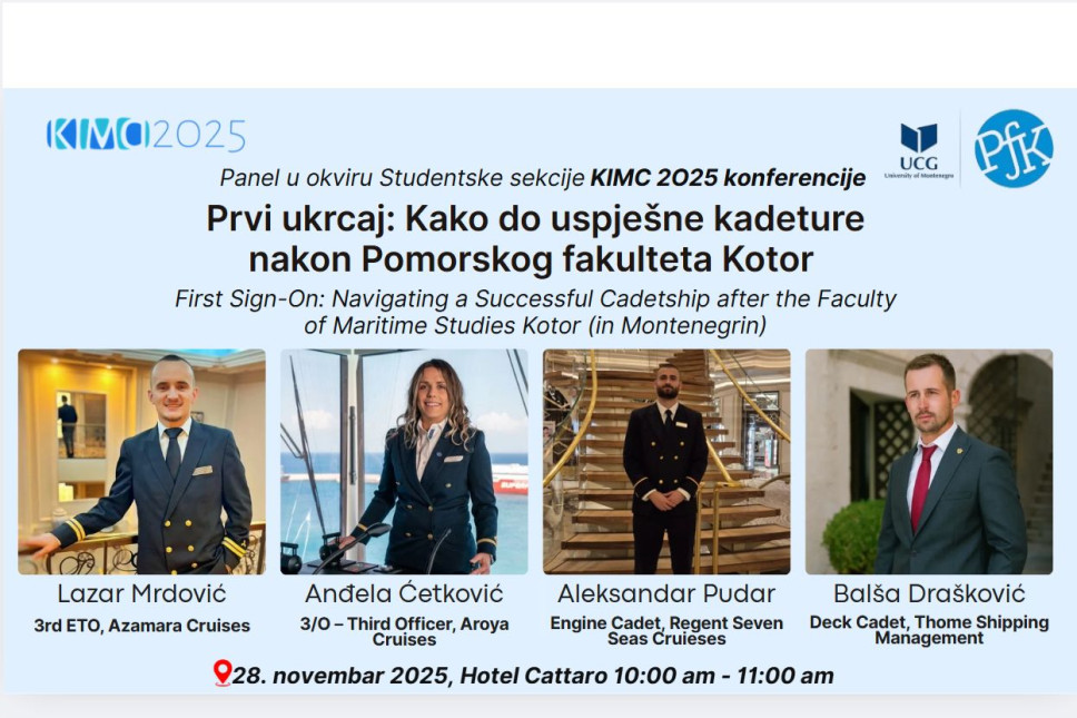 U okviru Studentske sekcije Pete međunarodne konferencije pomorskih nauka 5th Kotor International Maritime Conference - KIMC 2025, danas od 10 sati u hotelu Cattaro biće održan panel pod nazivom Prvi ukrcaj: Kako do uspješne kadeture nakon Pomorskog fakulteta Kotor.