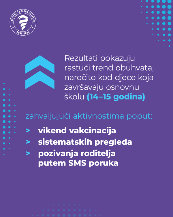 Rezultati pokazuju rastući trend obuhvata kod djece koja završavaju osnovnu školu (14–15 godina), zahvaljujući aktivnostima poput vikend-vakcinacija, sistematskih pregleda i pozivanja roditelja putem SMS poruka.