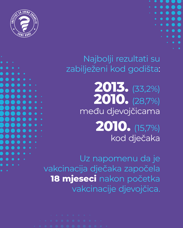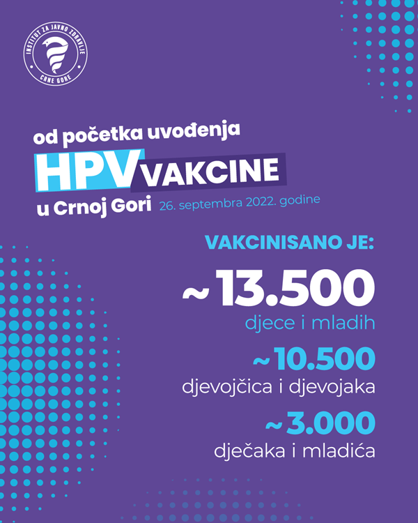 Od uvođenja HPV vakcine u Crnoj Gori, 26. septembra 2022. godine, vakcinisano je oko 13.500 djece i mladih, približno 10.500 djevojčica i djevojaka i oko 3.000 dječaka i mladića.