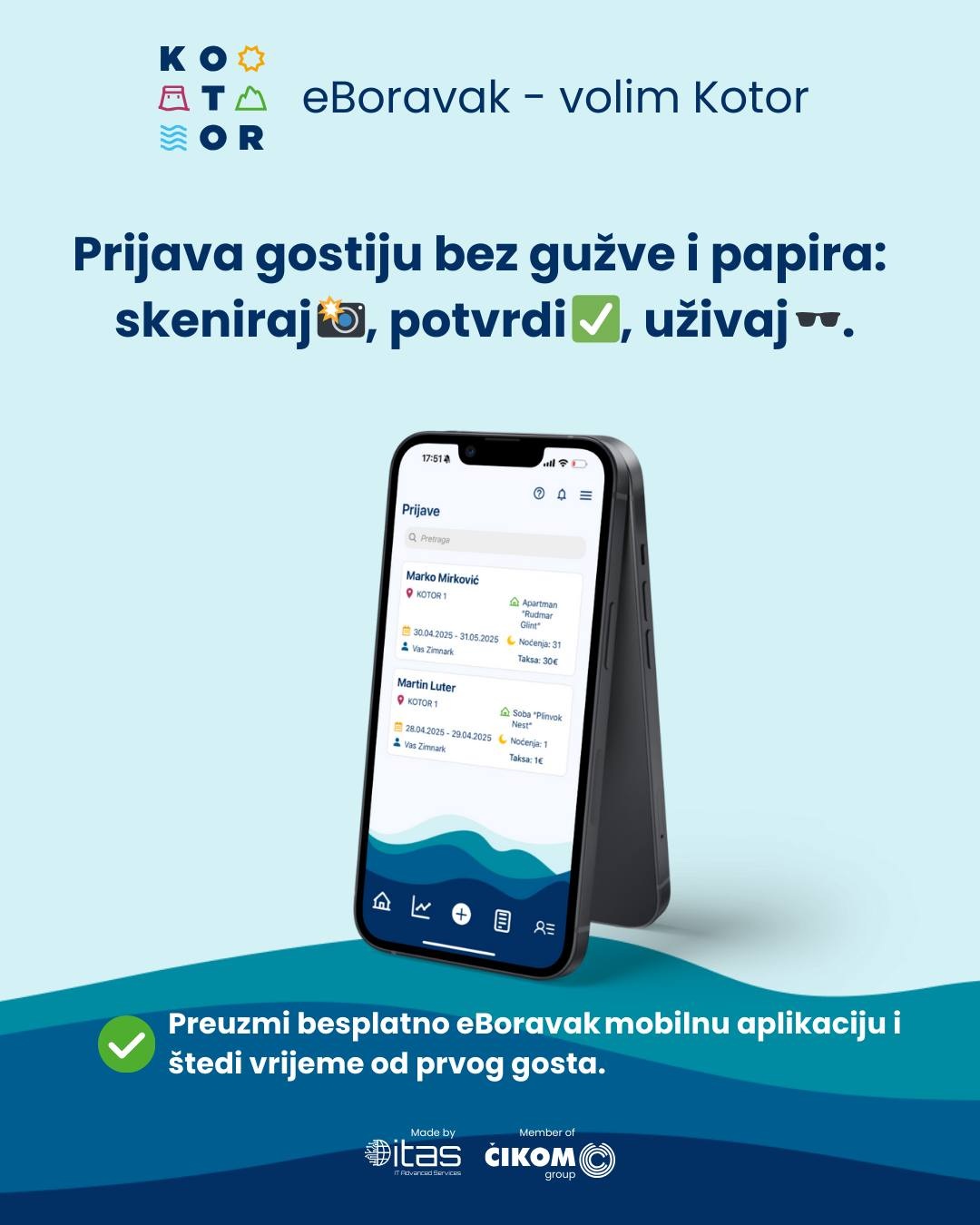 Turistička organizacija Kotor uvodi novu besplatnu mobilnu aplikaciju – eBoravak – volim Kotor, koja omogućava izdavaocima smještaja da digitalno prijave goste i obračunaju boravišnu taksu. Brzo, jednostavno i bez ikakvih troškova.