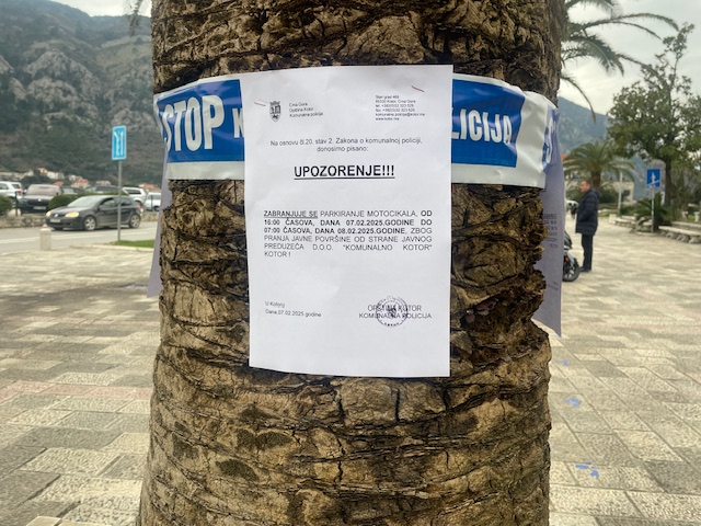 Na prostoru Gradske rive, je od danas u 16 časova do sjutra (8. februara) u 7 časova, zabranjeno parkiranje motocikala, navodi se u Upozorenju Komunalne policije Opštine Kotor.