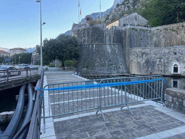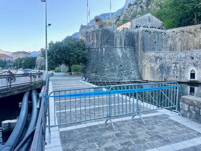 Naime, kako jutros bilježimo na terenu, na početku i na kraju mosta postavljene su metalne ograde na kojima su trake upozorenja Komunalne policije Opštine Kotor.