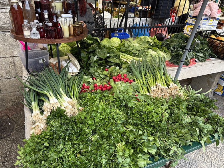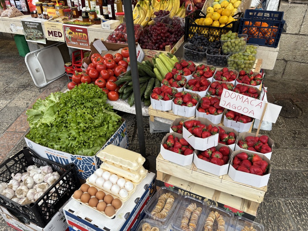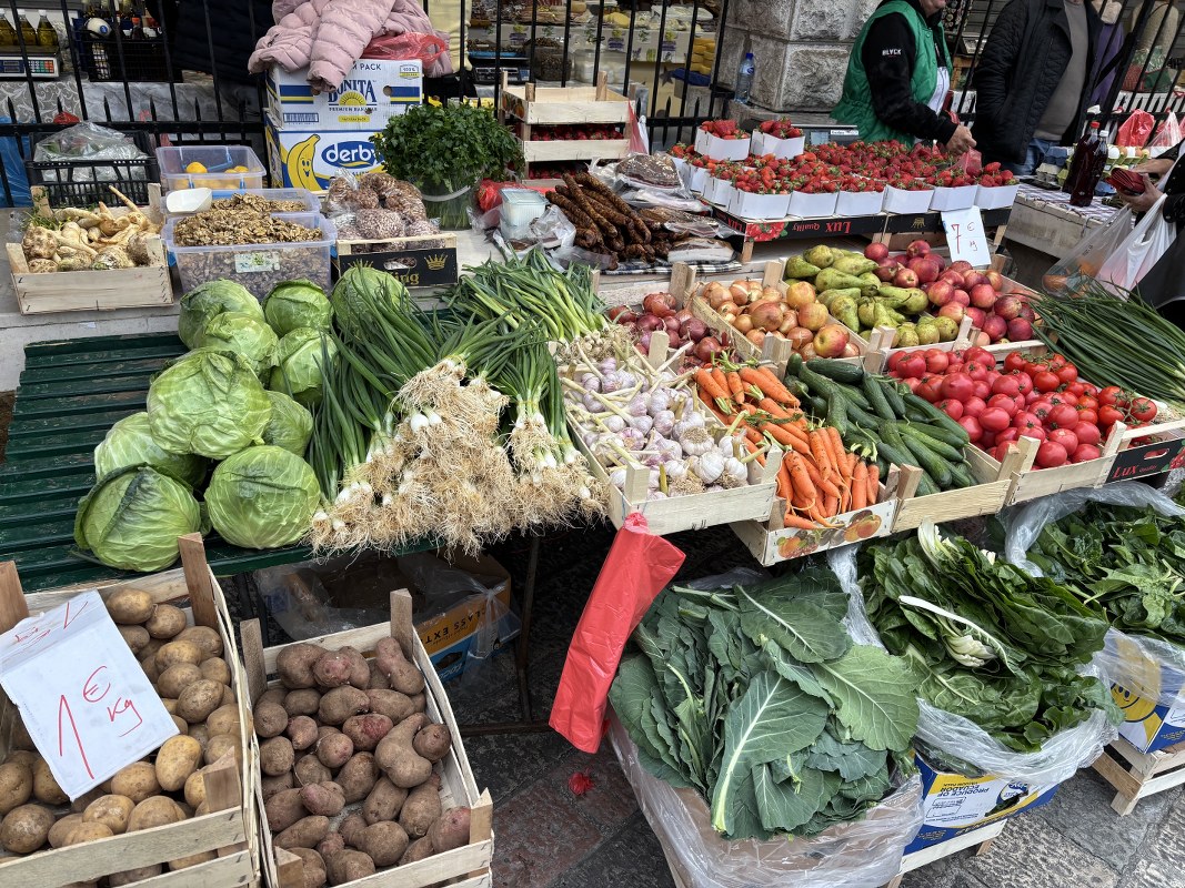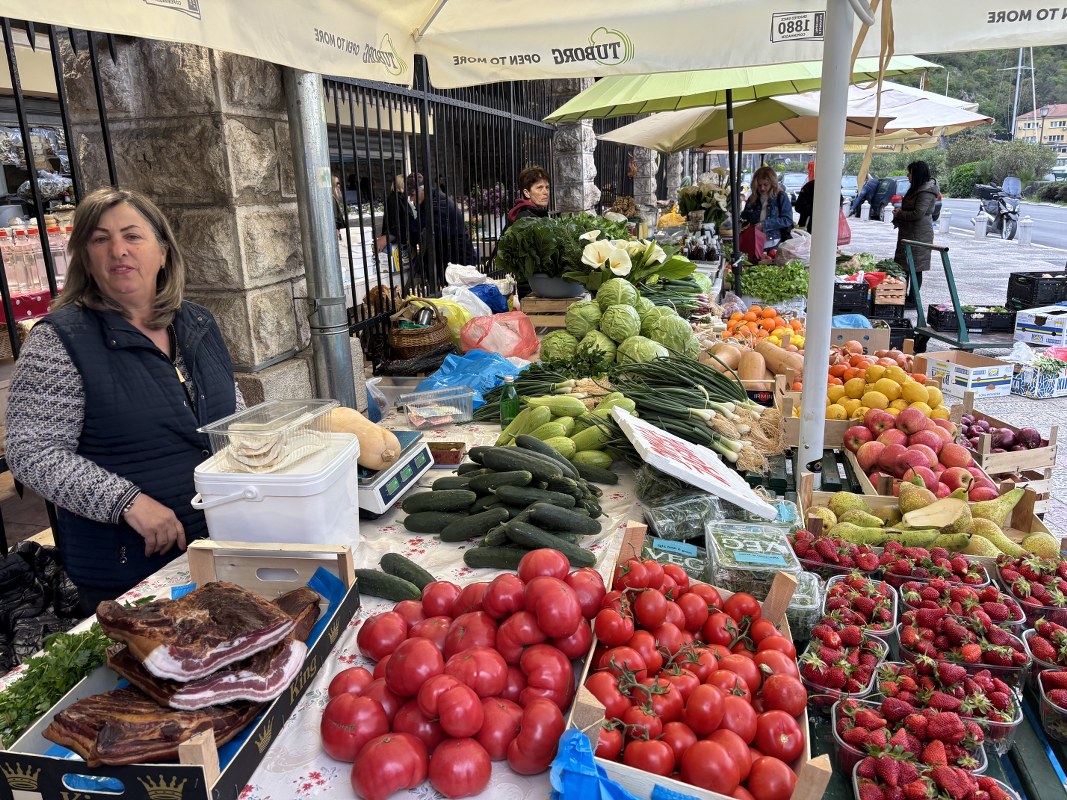 Na tezgama sa povrćem zimska salata, blitva, mladi raštan i verza prodaju se po 4 eura, poriluk 2 eura, bundeva 3 eura, karfiol i kupus 2 eura, crveni luk 3,5 eura, česan 10 eura, dok mladi luk košta 1,5 eura po vezi. Krastavci i paradajz koštaju po 5, čeri je 10 eura po kilogramu, dok boranija košta 8 eura. Veza rukole, bosiljka ili peršuna, kuka (kljuka) i šparoga prodaje se po cijeni od 1,5 euro.