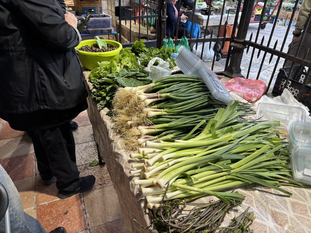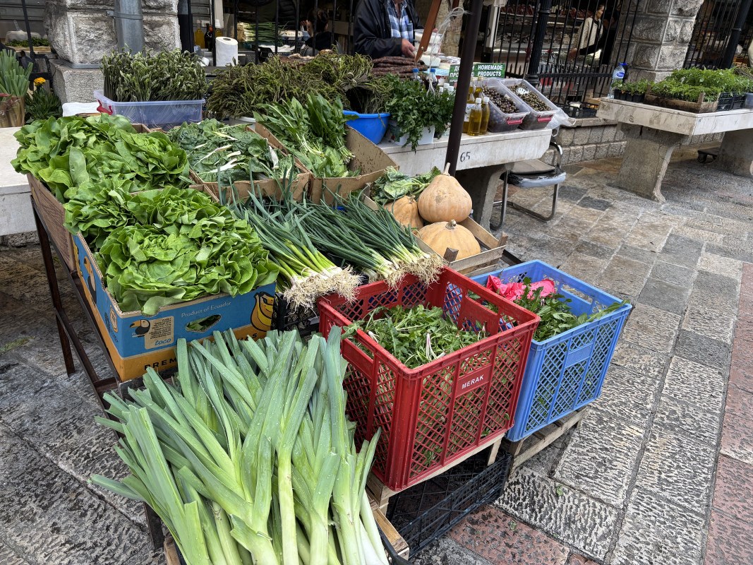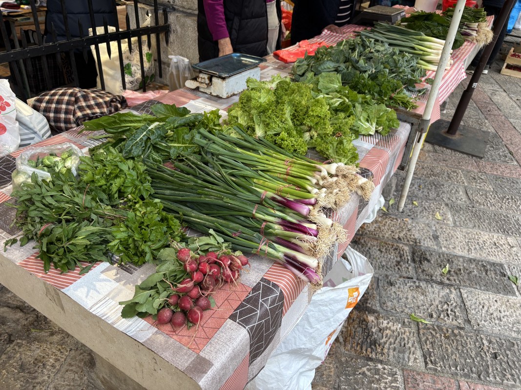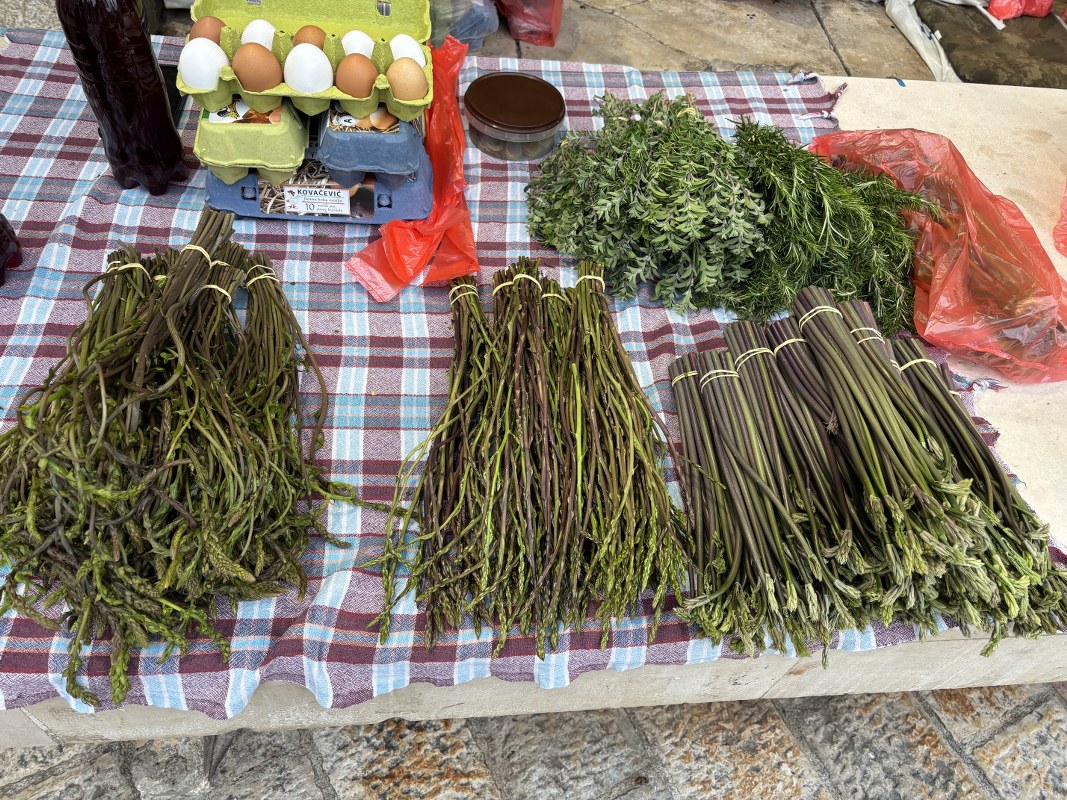 Na tezgama sa povrćem zimska salata, blitva, mladi raštan i verza prodaju se po 4 eura, poriluk 2 eura, bundeva 3 eura, karfiol i kupus 2 eura, crveni luk 3,5 eura, česan 10 eura, dok mladi luk košta 1,5 eura po vezi. Krastavci i paradajz koštaju po 5, čeri je 10 eura po kilogramu, dok boranija košta 8 eura. Veza rukole, bosiljka ili peršuna, kuka (kljuka) i šparoga prodaje se po cijeni od 1,5 euro.