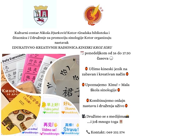 Uoči Dana kineskog jezika Ujedinjenih nacija koji se obilježava 20. aprila, Kulturni centar ,,Nikola Đurković'' Kotor / Gradska biblioteka i čitaonica i Udruženje za promociju sinologije Kotor organizuju nastavak edukativno-kreativnih radionica ,,Kineski kroz igru'' od ponedeljka 19. 04. 2021. Godine, obavještavaju iz Kulturnog centra.