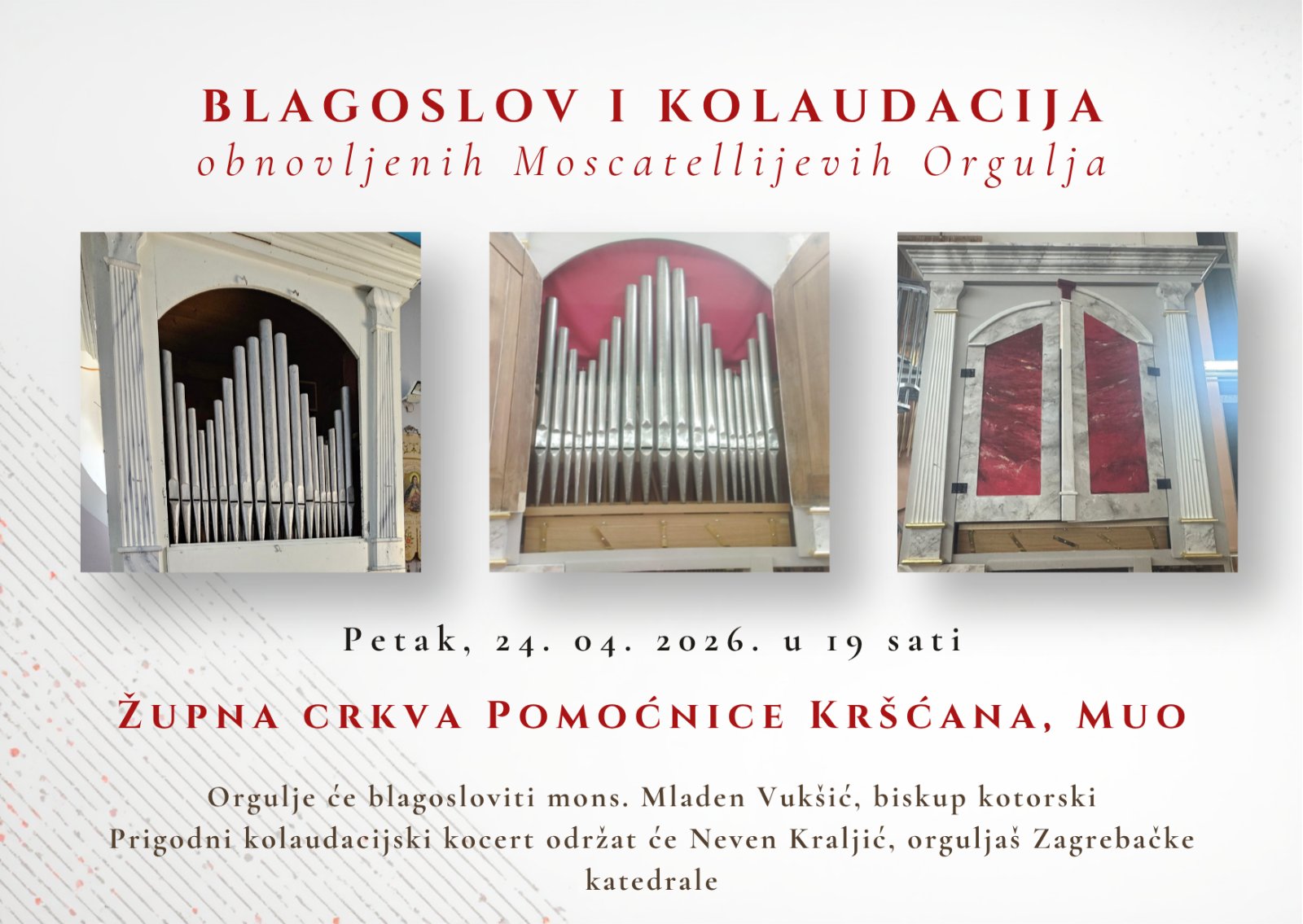 U Župnoj crkvi Pomoćnice Kršćana, Muo u petak, 24. aprila 2026. godine, s početkom u 19 sati, biće upriličen svečani blagoslov i kolaudacija obnovljenih Moscatellijevih orgulja.