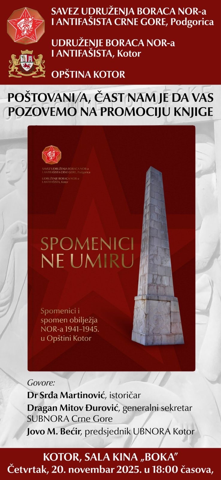 U okviru programa obilježavanja Dana opštine Kotor, danas (četvratak, 20. novembra), u sali Kina “Boka” biće održana promocija knjige “Spomenici ne umiru” – Spomenici i spomen obilježja NOR-a1941.-1945. u opštini Kotor.