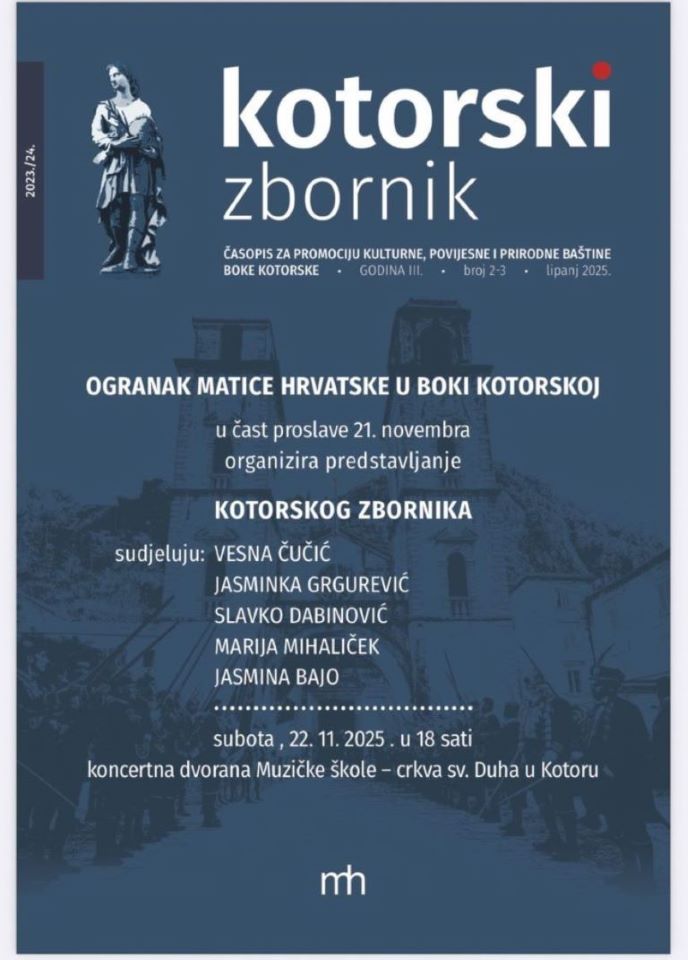 Ogranak Matice hrvatske u Boki Kotorskoj, u okviru programa proslave Dana opštine Kotor, organizuje predstavljanje novog broja Kotorskog zbornika – časopisa za promociju kulturne, povijesne i prirodne baštine Boke Kotorske.