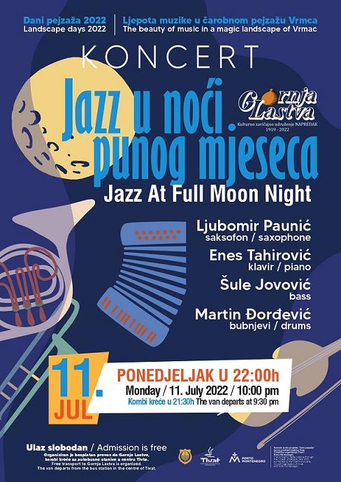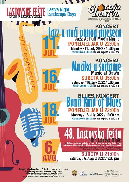 Kulturno-zavičajno udruženje “Napredak” iz Gornje Lastve, u okviru manifestacije “Lastovske fešte-Dani pejzaža 2022” organizuje koncert “Jazz u noći punog mjeseca” u ponedjeljak 11. jula sa početkom u 22 sata u Gornjoj Lastvi.