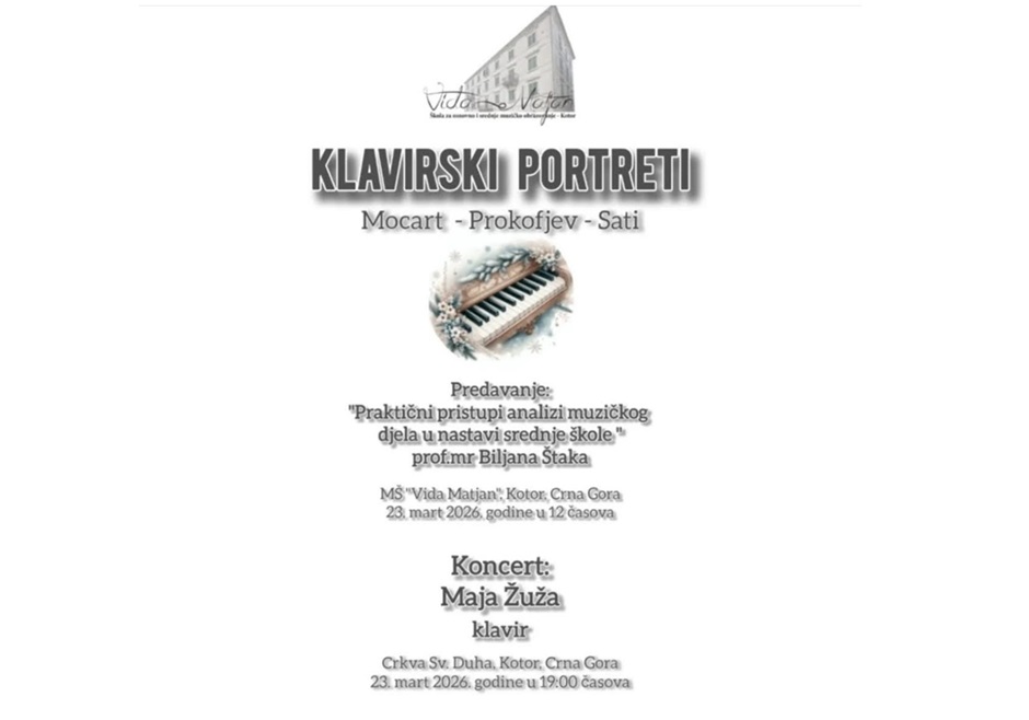 Škola za osnovno i srednje muzičko obrazovanje „Vida Matjan“ sjutra organizuje program pod nazivom „Klavirski portreti – Mocart, Prokofjev, Sati“.