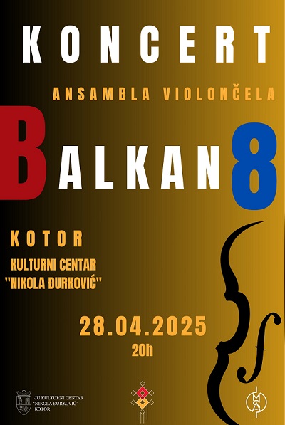 Koncert Ansambla violončela Balkan 8 održaće se uKotoru, u Kulturnom centru Nikola Ðurković u ponedjeljak 28. aprila 2025. godine sa početkom u 20 sati. Ulaz je slobodan.