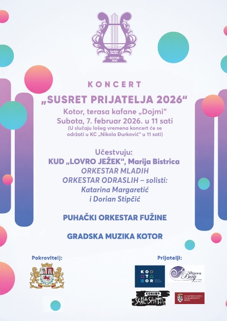 Gradska muzika Kotor najavljuje koncert "Susret prijatelja 2026" koji će se održati u subotu, 7. februara u 11 sati na terasi kafane "Dojmi".