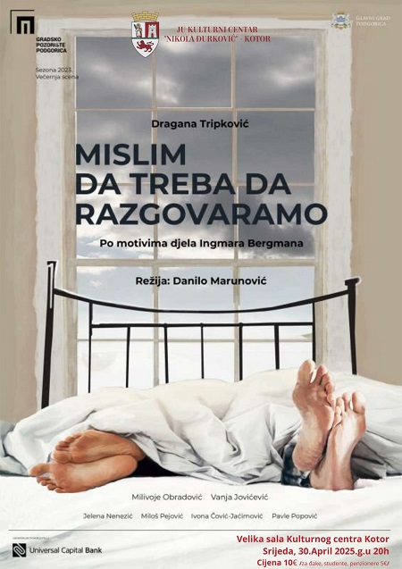 Predstava “Mislim da treba da razgovaramo”, rađena u produkciji Gradskog pozorišta iz Podgorice, biće odigrana u kotorskom Kulturnom centru večeras sa početkom u 20 časova.