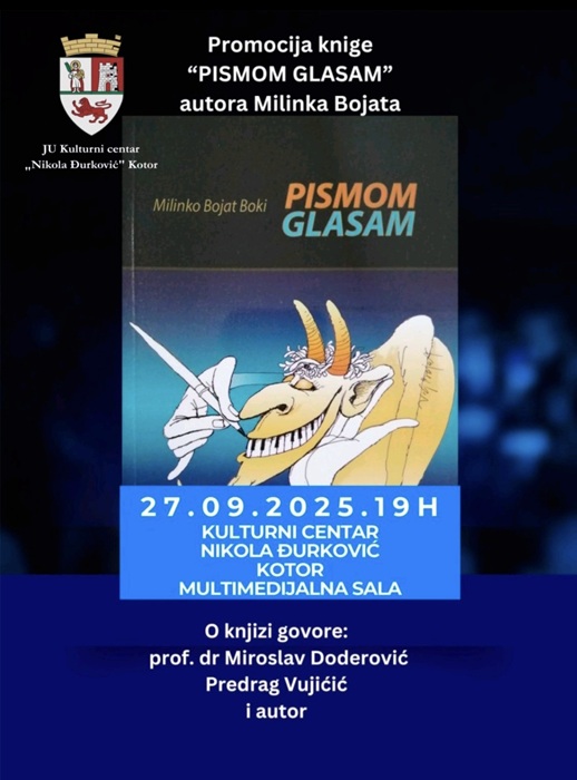 Promocija knjige “Pismom glasam” autora Milinka Bojata Bokija biće održana u multimedijalnoj sali kotorskog Kulturnog centra u subotu 27.septembra 2025.g.