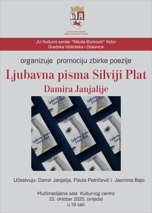 Kulturni centar „Nikola Đurković“ Kotor, Gradska biblioteka i čitaonica danas organizuje promociju knjige poezije Damira Janjalije ,,Ljubavna pisma Silviji Plat’’.