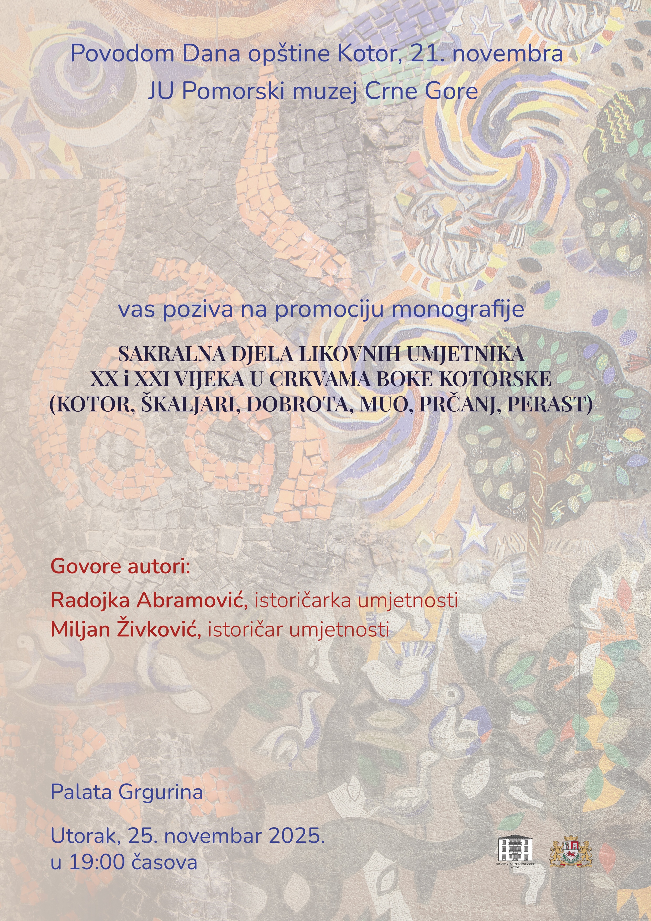 Povodom Dana opštine Kotor 21. novembra, Javna ustanova Pomorski muzej Crne Gore Kotor organizuje promociju monografije “Sakralna djela likovnih umjetnika XX i XXI vijeka u crkvama Boke Kotorske (Kotor, Škaljari, Dobrota, Muo, Prčanj, Perast)” danas, sa početkom u 19 sati.