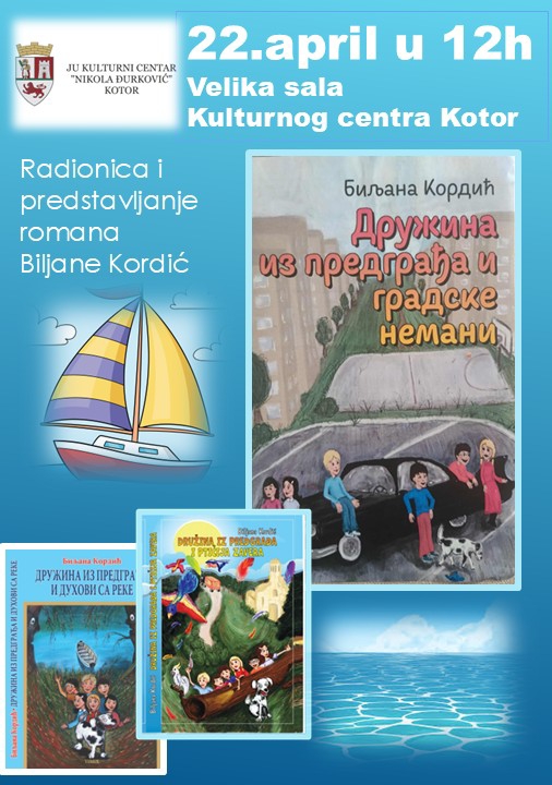 Radionica i predstavljanje romana autorke Biljane Kordić biće održani u Velikoj sali Kulturnog centra „Nikola Đurković’’ 22. aprila, sa početkom u 12 časova.