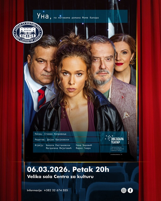 U petak, 06. marta s početkom u 20 časova u Velikoj sali Centra za kulturu u Tivtu, publika će imati priliku da pogleda predstavu “UNA” u produkciji Zvezdara teatra iz Beograda. Predstava koju je režirao Dejan Projkovski, rađena je po tekstu Stevana Koprivice, dok prepoznatljivu glumačku ekipu čine: Nikola Ristanovski, Sena Đorović, Magdalena Mijatović, Marko Gvero.