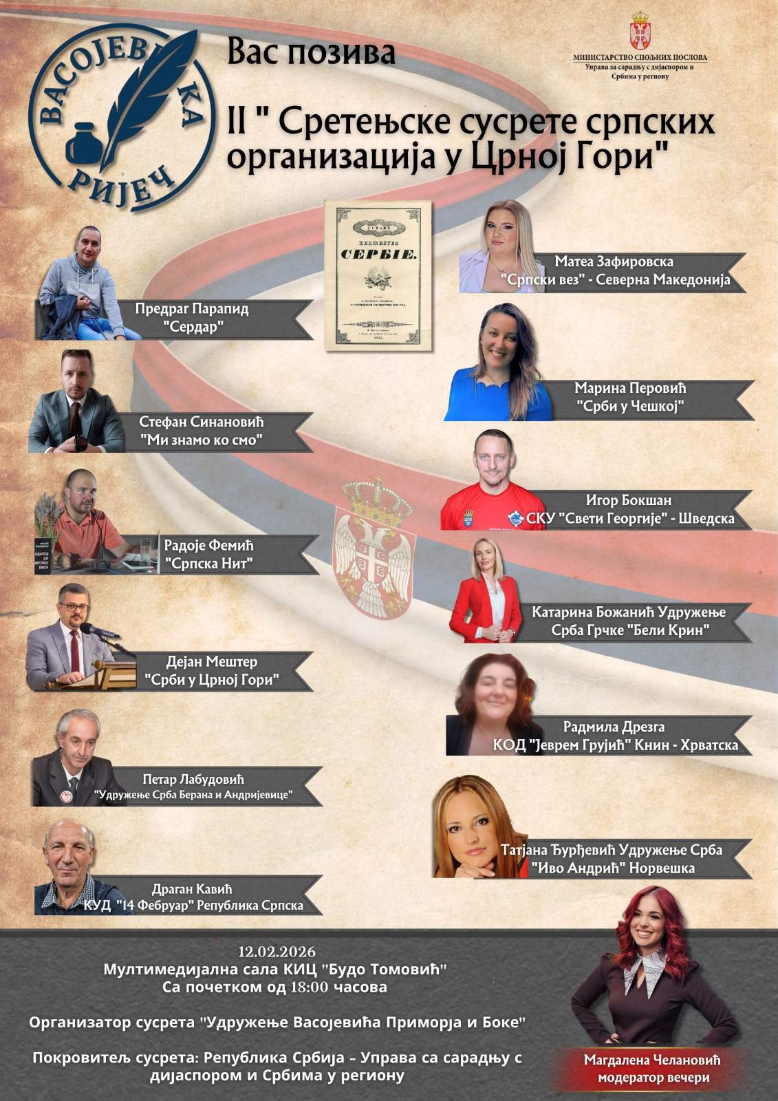 Vasojvićka riječ vas poziva na II „Sretenjske susrete srpskih organizacija u Crnoj Gori“, koji će biti održani u srijedu, 12. februara 2026. godine, u multimedijalnoj sali KIC-a „Budo Tomović“ u Podgorici, sa početkom u 18 časova.