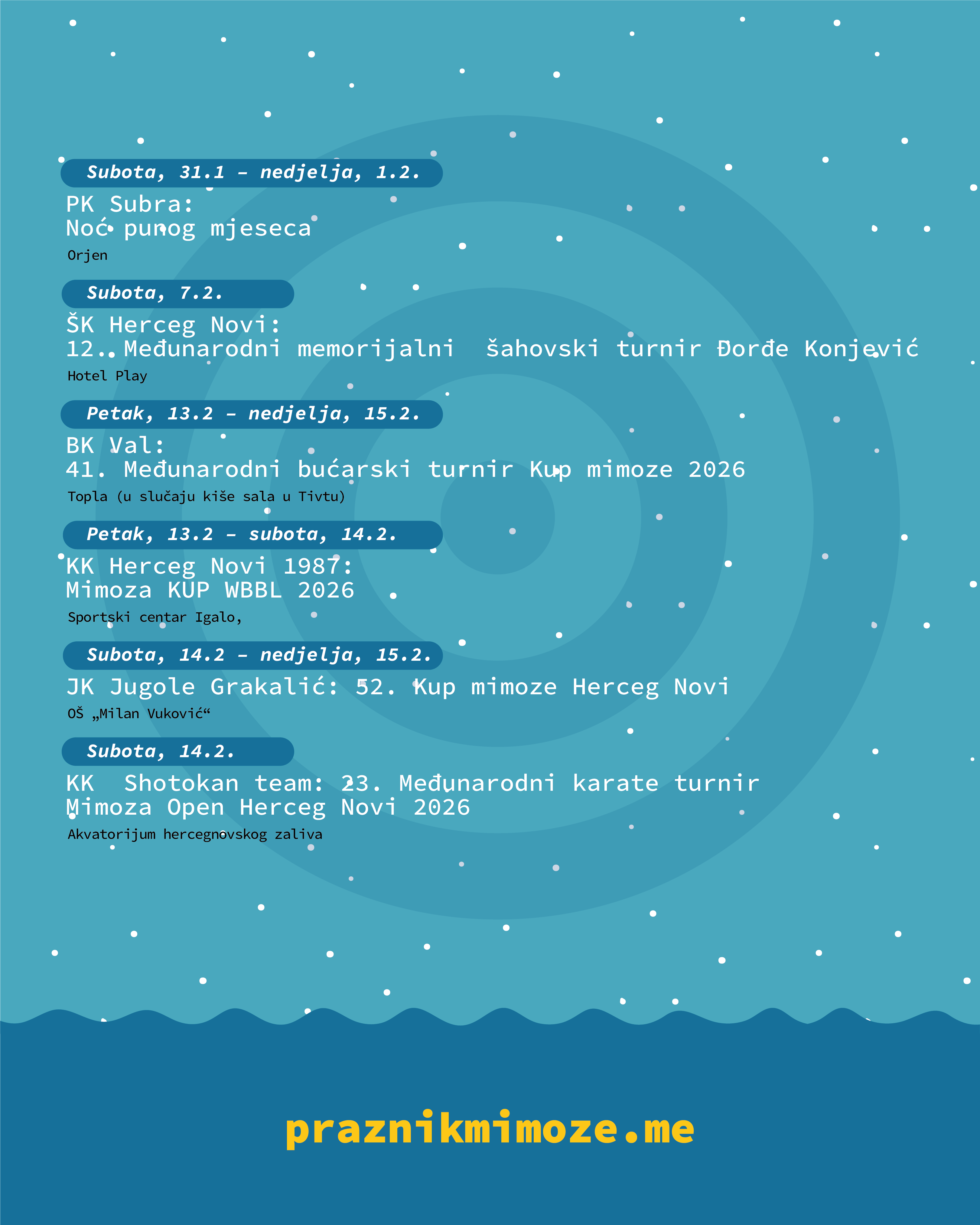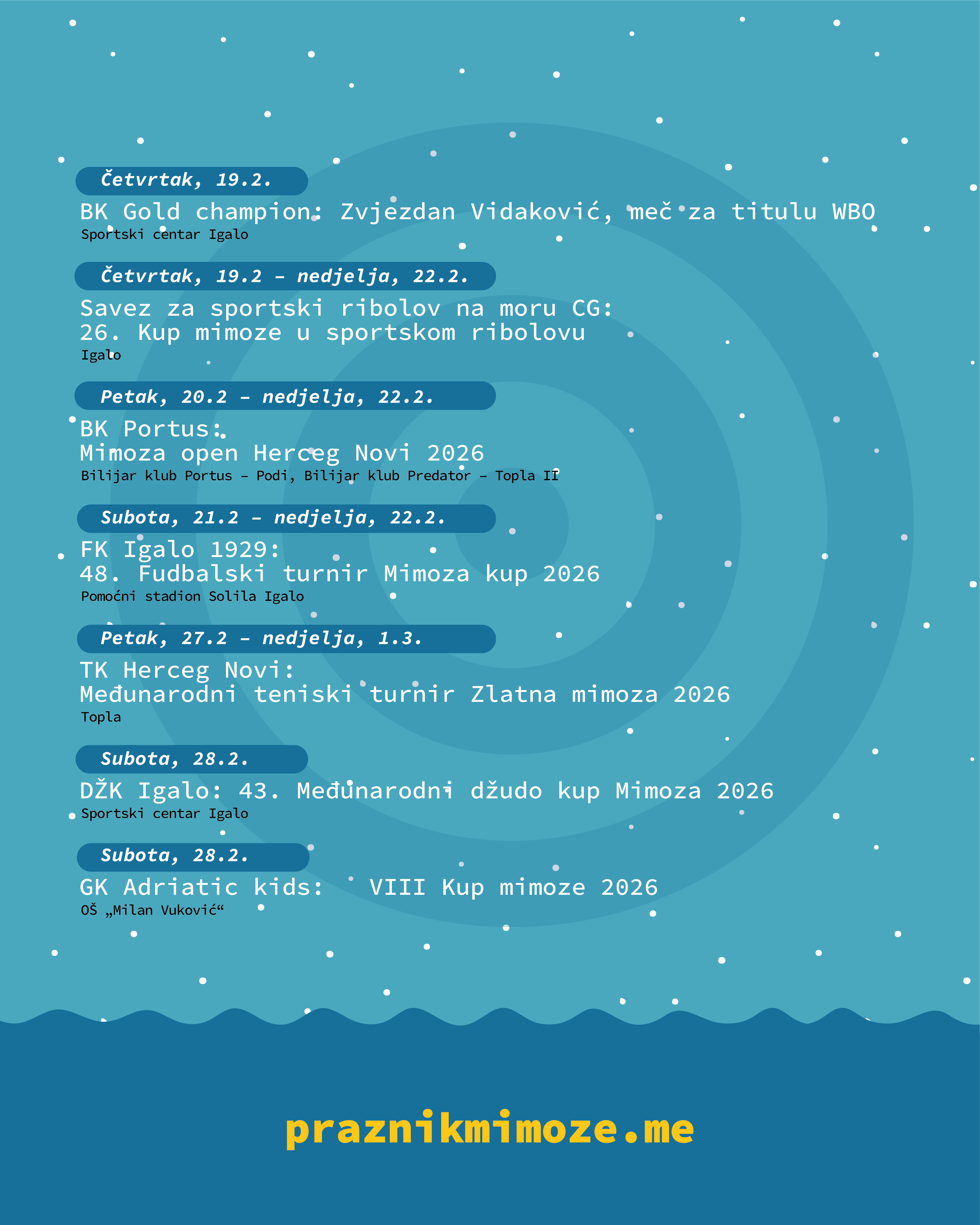 Pod sloganom „Dok sve spava, mimoza se budi“ ovogodišnji Praznik mimoze ponudiće 19 sportskih takmičenja, među kojima su turniri sa višedecenijskom tradicijom, ali i novi sadržaji.