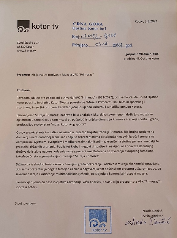 Kotor TV uputuo je zvaničan poziv gradonačelniku Kotora Vladimir V Jokic da ispred Opštine Kotor podrži inicijativu. "Iskreno vjerujemo da naša inicijativa zavrjeđuje Vašu podršku, a sve u cilju prosperiteta VPK “Primorac” i sporta u Kotoru."