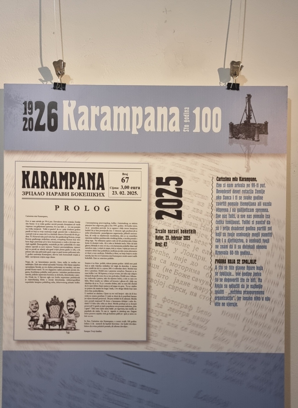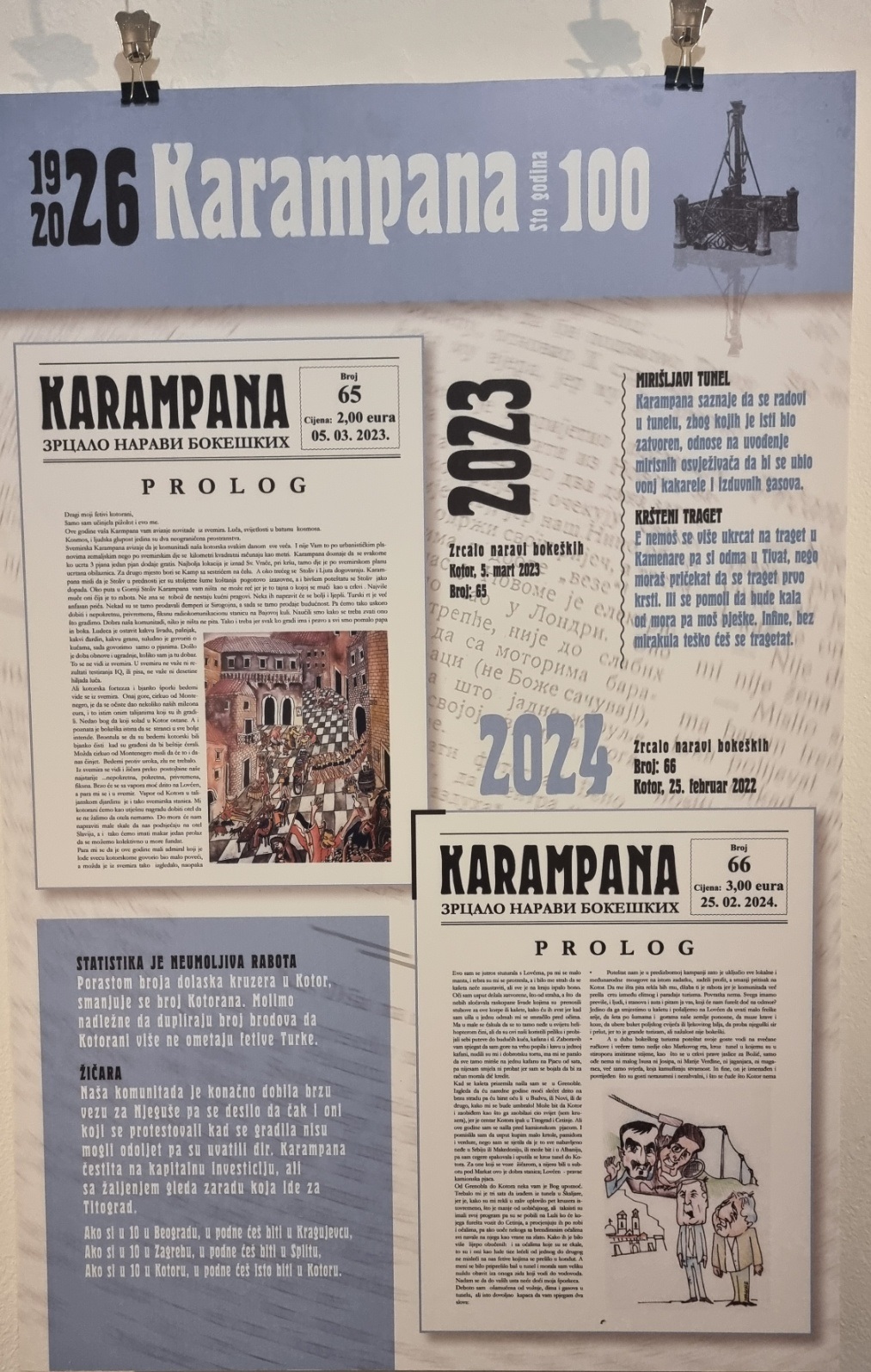 Poštovani korisnici portala Radio Kotora, u galeriji fotografija predstavljamo naslovne strane lista „Karampana“. Riječ je o svojevrsnoj postavci predstavljenoj prekjuče u Gradskoj galeriji Kotor, a detalje, kako se kaže u jednom broju, “možete viđet ako malo bolje pogledate”. U prevodu, u konkretnoj ponudi, kliknite na vašem ekranu na datu fotografiju, upamtite u vašem uređaju za bolji uvid, uvečajte pomoću + za sitnija slova u skladu sa dioptrijom i čitajte.