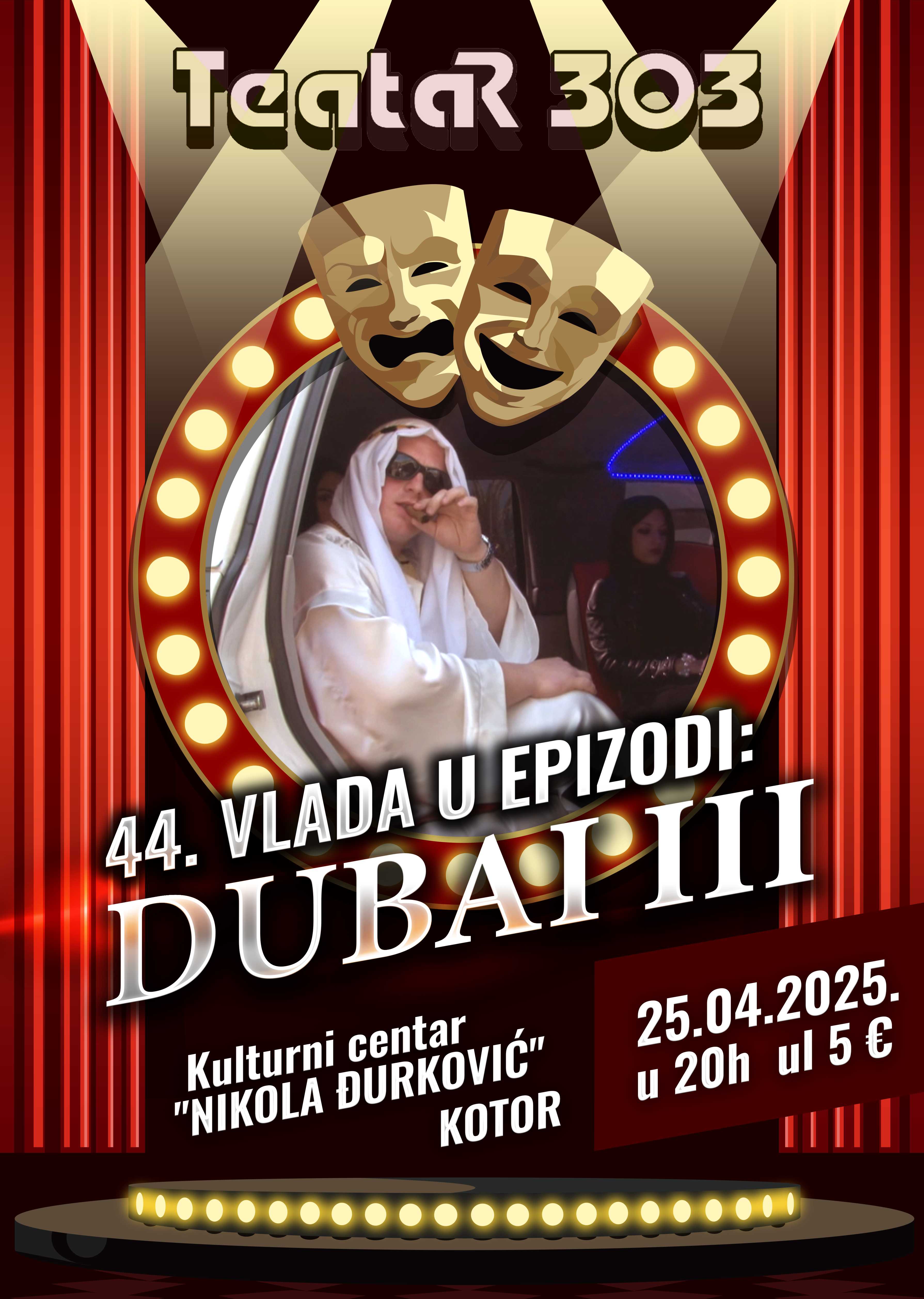 Teatar 303 iz Kotora, jedan od najdugovječnijih amaterskih teatara u regionu koji decenijama uspješno spaja humor i društvenu satiru, ponovo nastupa u Kotoru-ovoga puta sa multimedijalnim programom pod intrigantnim nazivom „44. Vlada u epizodi: Dubai 3“.
