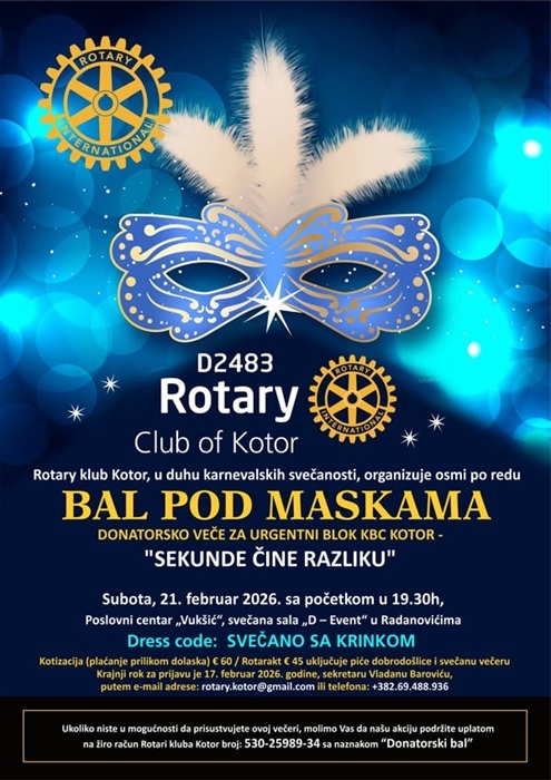 Rotary klub Kotor, u duhu tradicionalnih kotorskih karnevalskih svečanosti, sa velikim zadovoljstvom vas poziva na osmi po redu Donatorski Bal pod maskama, koji će se održati u subotu, 21. februara 2026. godine, sa početkom u 19:30 časova, u svečanoj sali „D–Event“ – Poslovni centar Vukšić, u Radanovićima. Ovogodišnji bal posvećen je Global Grant projektu „Za Urgentni blok KBC Kotor - Sekunde čine razliku“, koji Rotary Club Kotor realizuje zajedno sa našim pobratimskim klubom – Rotary Club Bari iz Italije. Ovaj projekat ima za cilj modernizaciju Urgentnog bloka KBC Kotor i nabavku ključne medicinske opreme neophodne za bržu trijažu, kontinuirani monitoring vitalnih funkcija i efikasnije zbrinjavanje hitnih slučajeva. Upravo u trenucima kada „svaka sekunda čini razliku“, želimo da zajedničkim snagama unaprijedimo uslove liječenja za naše građane i sve posjetioce Boke Kotorske. Kotizacija po osobi iznosi 60€, dok je kotizacija za članove Rotarakta 45€, i uključuje piće dobrodošlice i svečanu večeru. Dress code: Svečano sa krinkom (maskom na licu). Krajnji rok za prijave je 17. februar 2026. godine, a prijave se podnose sekretaru kluba, g. Vladanu Baroviću, putem e-mail adrese: rotary.kotor@gmail.com ili na telefon +382 69 498 386.