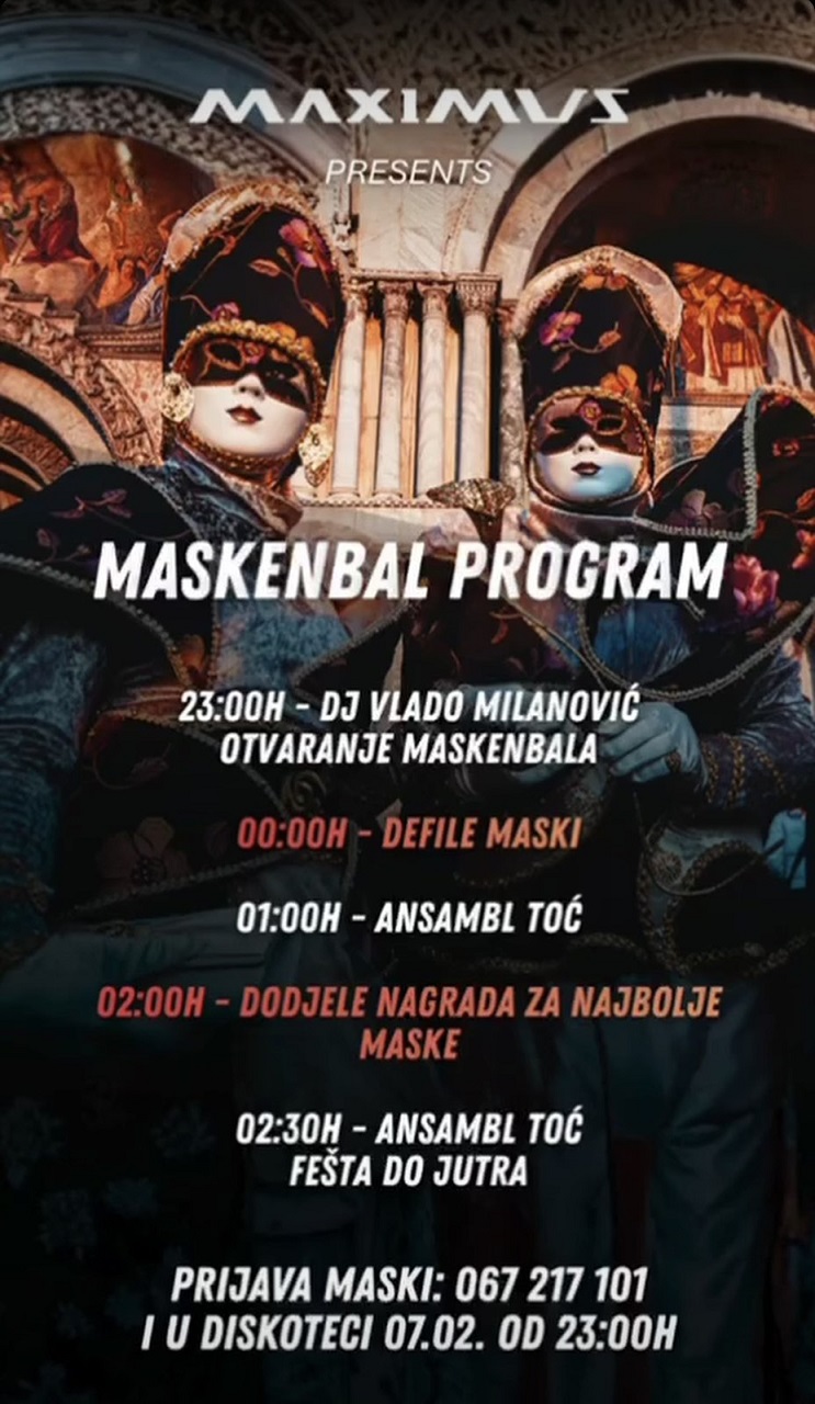 Veliki maskenbal biće održan u diskoteci Maximus, u subotu 7. februara sa početkom u 23 sata.